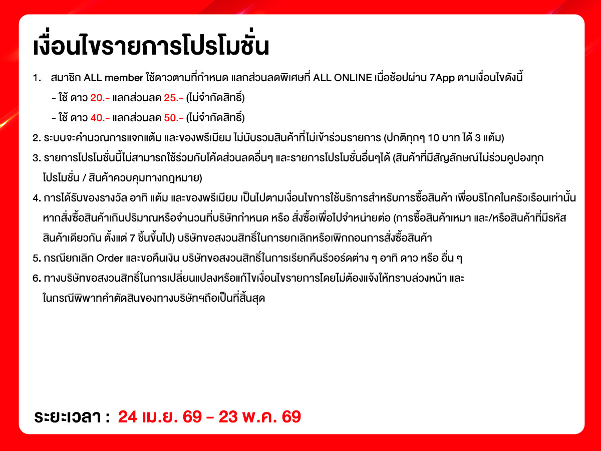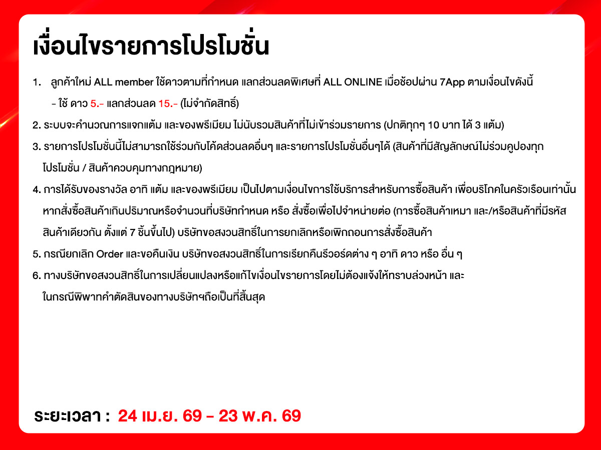 โปรนี้จัดเต็มตั้งแต่วันที่ 24 เมษายน 2569 – 23 พฤษภาคม 2569 เท่านั้น ใครที่กำลังเล็งของไว้ หรือกำลังจะกดสั่งสินค้า บอกเลยว่าช่วงนี้เหมาะที่สุด เพราะแค่มีดาว ก็เปลี่ยนเป็นส่วนลดได้ทันทีแบบไม่ต้องรอลุ้น