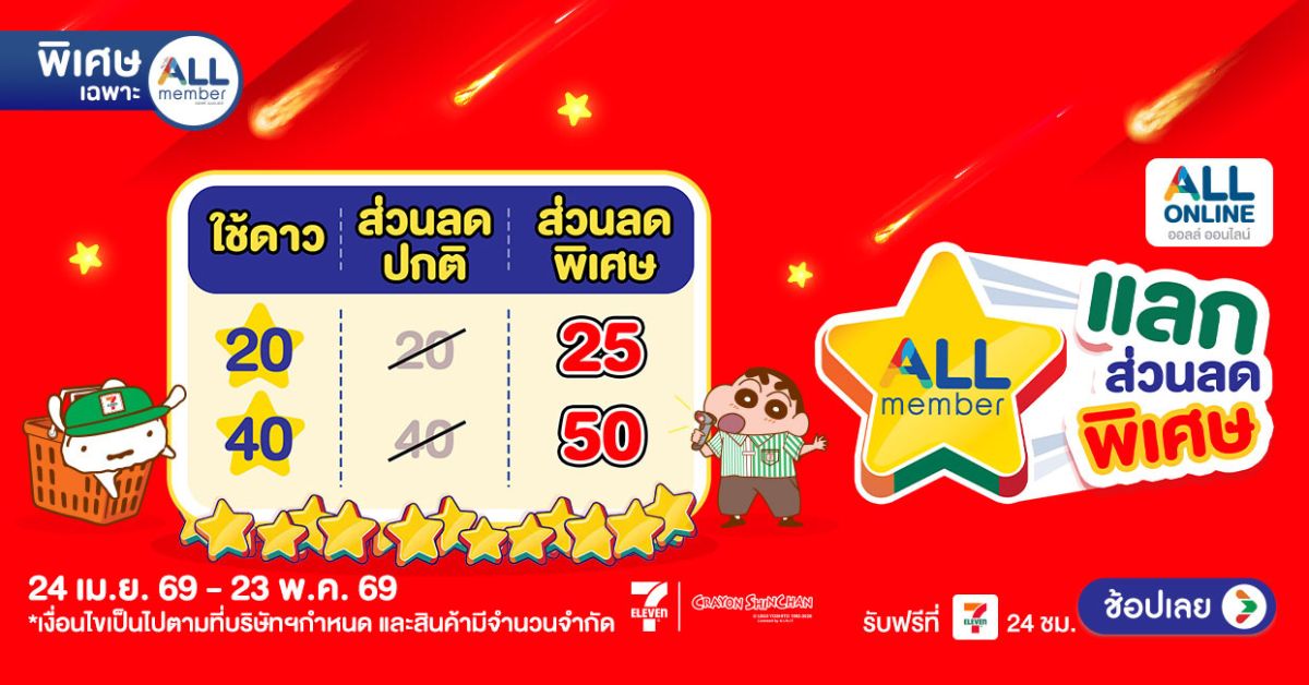 ใครเป็นสายช้อปต้องห้ามพลาด! เพราะช่วงนี้ ชินจังจอมป่วนมาชวนทุกคนใช้ “ดาว” ให้คุ้มกว่าเดิม กับดีล แลกส่วนลดพิเศษ ที่ยิ่งใช้ ยิ่งคุ้ม ไม่ว่าจะเป็นลูกค้าใหม่ หรือสายช้อปตัวจริงที่เป็นสมาชิก ALL member อยู่แล้ว ก็ฟินได้เหมือนกัน มาล่าดาว เซเว่นกันเถอะ!