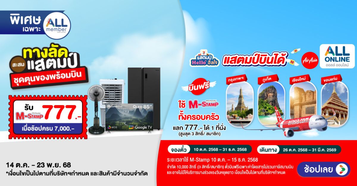 อย่ารอช้า! รีบเข้าไปช้อปที่ ALL ONLINE แล้วเริ่มสะสม M Stamp ตั้งแต่วันนี้ เพื่อให้ “แสตมป์บินได้” ของคุณพาบินฟรีในฝัน 🛩️✨