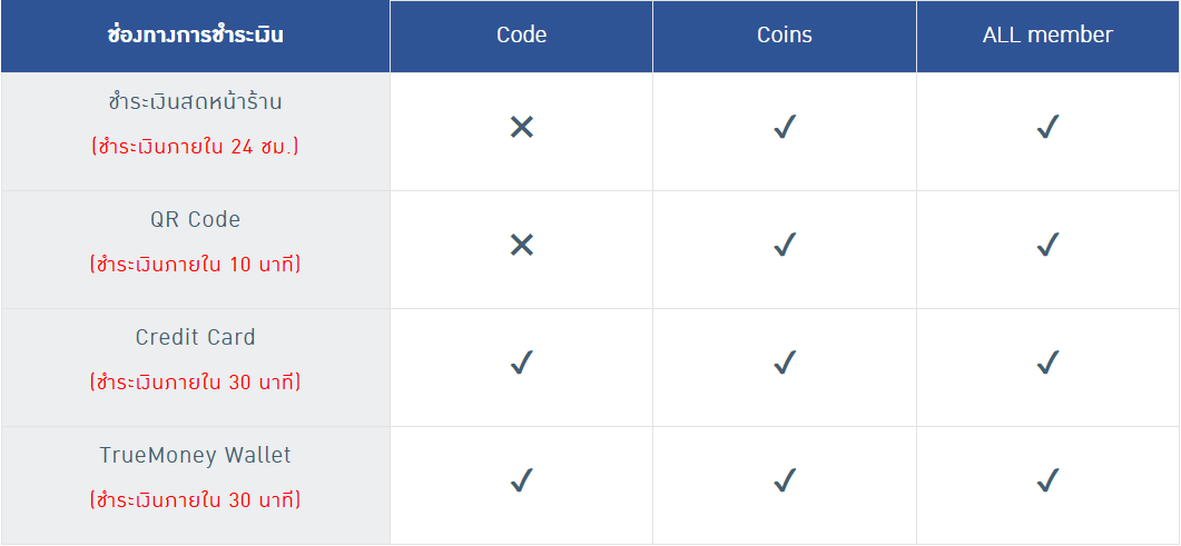 - กรณีลูกค้าเลือกชำระผ่านช่องทาง Credit Card หรือ True Money Wallet หากชำระเงินไม่สำเร็จ ลูกค้าจะได้รับ Code, Coins, แต้ม ALL member คืนเข้าระบบภายใน 30 นาที