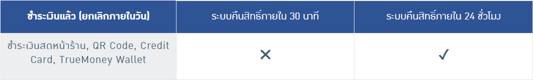 - กรณีลูกค้าชำระค่าสินค้าแล้ว และทำการแจ้งยกเลิกออเดอร์ภายในวัน ระบบจะคืนสิทธิ์การสั่งซื้อสินค้าให้อีกครั้ง ภายใน 24 ชั่วโมง