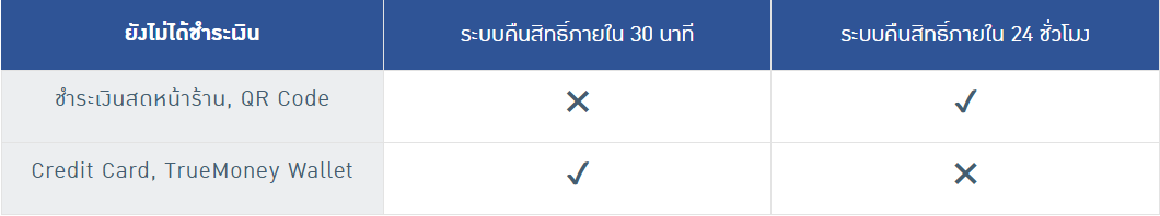 - กรณีลูกค้าสั่งซื้อสินค้าและเลือกชำระผ่านช่องทาง Creadit Card, TrueMoney Wallet แต่ยังไม่ได้ชำระเงิน ระบบจะคืนสิทธิ์การสั่งซื้อสินค้าให้อีกครั้งภายใน 30 นาที