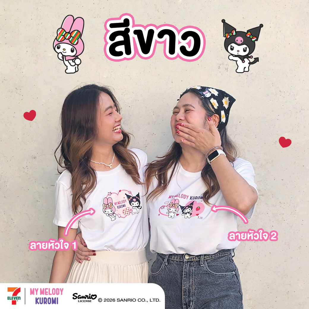 “เสื้อมายเมโลดี้และเสื้อคุโรมิ” สีขาวลายหัวใจสุดน่ารัก มาด้วยกัน 2 ลายให้แฟนๆ ของ Sanrio ได้มาเลือกจองเป็นเจ้าของ มีให้เลือกได้ถึง 3 ไซซ์ (M, L, XL) ลายหัวใจทั้ง 2 แบบออกแบบมาให้ใส่คู่กับเพื่อนหรือคนพิเศษได้แบบคิวต์ๆ สไตล์เพื่อนซี้ต่างขั้ว ฝั่งหนึ่งเป็นมายเมโลดี้สายหวานละมุน ส่วนอีกฝั่งเป็นคุโรมิสายซนสุดเท่