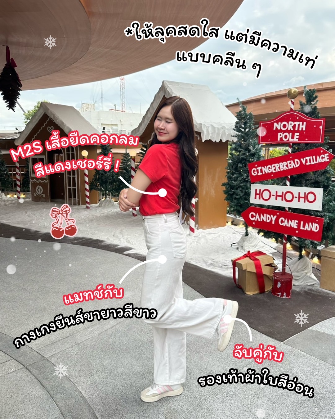 เสื้อยืดคอกลม M2S Lifestyle สีแดงเชอร์รี่ + กางเกงยีนส์ขายาวสีขาว มีสไตล์เรียบง่ายแต่สดใส! เท่แต่มีความคลีน ๆ เหมาะกับช่วงเทศกาลคริสต์มาสและปีใหม่สุด ๆ เสื้อสีแดงทำให้เพิ่มความโดดเด่นบวกกับกางเกงสีขาวจะเพิ่มความอบอุ่นให้กับลุค ทำให้รู้สึกสะอาดตา บอกเลยว่าดูคลีนแบบมีสไตล์มาก! ปิดท้ายด้วยรองเท้าผ้าใบสีอ่อน ที่จะเพิ่มความชิลและสบาย เหมาะกับการเดินเล่นและถ่ายรูปธีมคริสต์มาสที่จะถึงนี้ได้อย่างลงตัว ฟินสุด ๆ