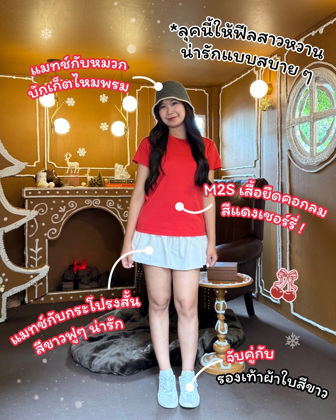ลุคนี้เรายังจะจับเสื้อยืดคอกลม M2S Lifestyle สีแดงเชอร์รี่ มาแมทช์กับกระโปรงสั้นสีขาวฟู ๆ น่ารัก ลุคนี้ให้ฟีลแบบสาวหวานสดใสในวันคริสต์มาสแบบสบาย ๆ เพิ่มความน่ารักขึ้น ด้วยหมวกบักเก็ตไหมพรมทำให้ละมุนสุด ๆ ! จับคู่กับรองเท้าผ้าใบสีขาวน่ารักสบายตา ลุคนี้เหมาะกับวันพักผ่อนในช่วงเทศกาลปลายปีมาก ๆ เพิ่มความโดดเด่นจากเสื้อสีแดงและให้กลิ่นอายความอบอุ่นของฤดูหนาว เหมาะกับการออกไปคาเฟ่ ถ่ายรูปเดินเล่นรับบรรยากาศของคริสต์มาสและปีใหม่สุด ๆ ลุคนี้แนะนำมาก ลองดูนะ!