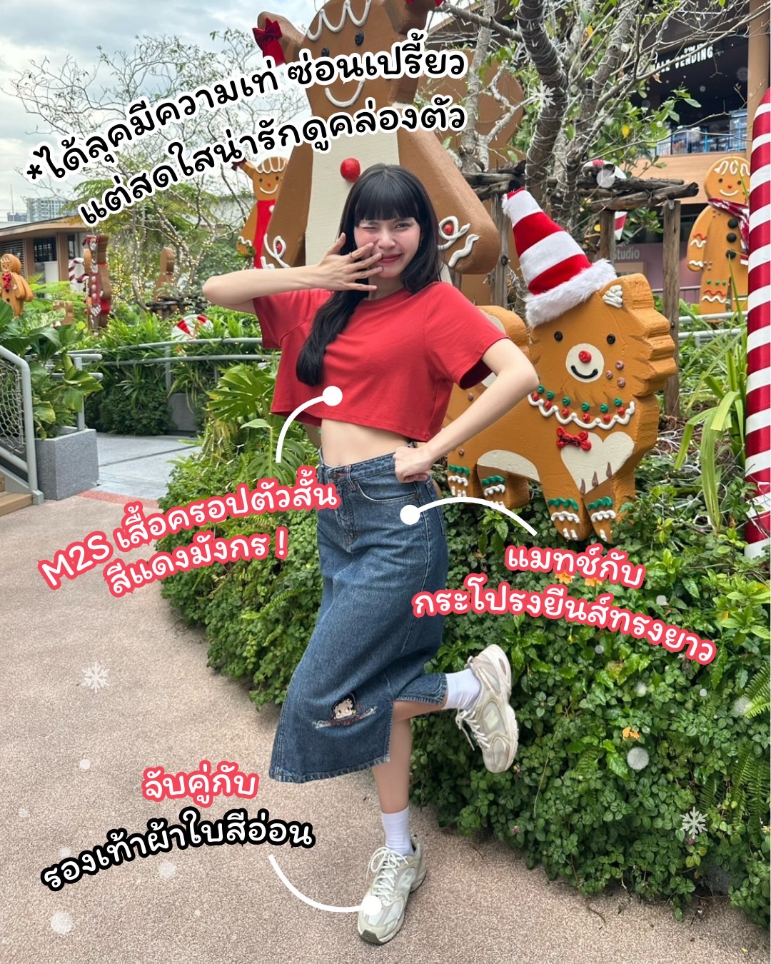 มาถึงลุคที่สาม! กับเสื้อยืดครอป M2S Lifestyle สีแดงมังกร + กระโปรงยีนส์ทรงยาวที่ให้ความรู้สึกเท่ซ่อนเปรี้ยว แต่ยังคงความน่ารักขี้เล่น สดใสในสไตล์คริสต์มาสได้อย่างลงตัว! เสื้อครอปสีแดงมังกรจะเพิ่มความโดดเด่นและเสริมความมั่นใจของคุณได้ ยิ่งเสื้อสีแดงที่แมทช์เข้ากับกระโปรงยีนส์ทรงยาวสุดชิค ให้ลุคที่ดูสบาย แถมยังดูแฟชั่นนิสต้ามาก ๆ ยิ่งคู่กับรองเท้าผ้าใบสีอ่อนเพิ่มความคล่องตัวมากขึ้น เสื้อครอปสีแดงกับลุคนี้ เหมาะกับการไปร่วมกิจกรรมธีมคริสต์มาสและงานปีใหม่ได้อย่างมีสไตล์เลยแหละ !