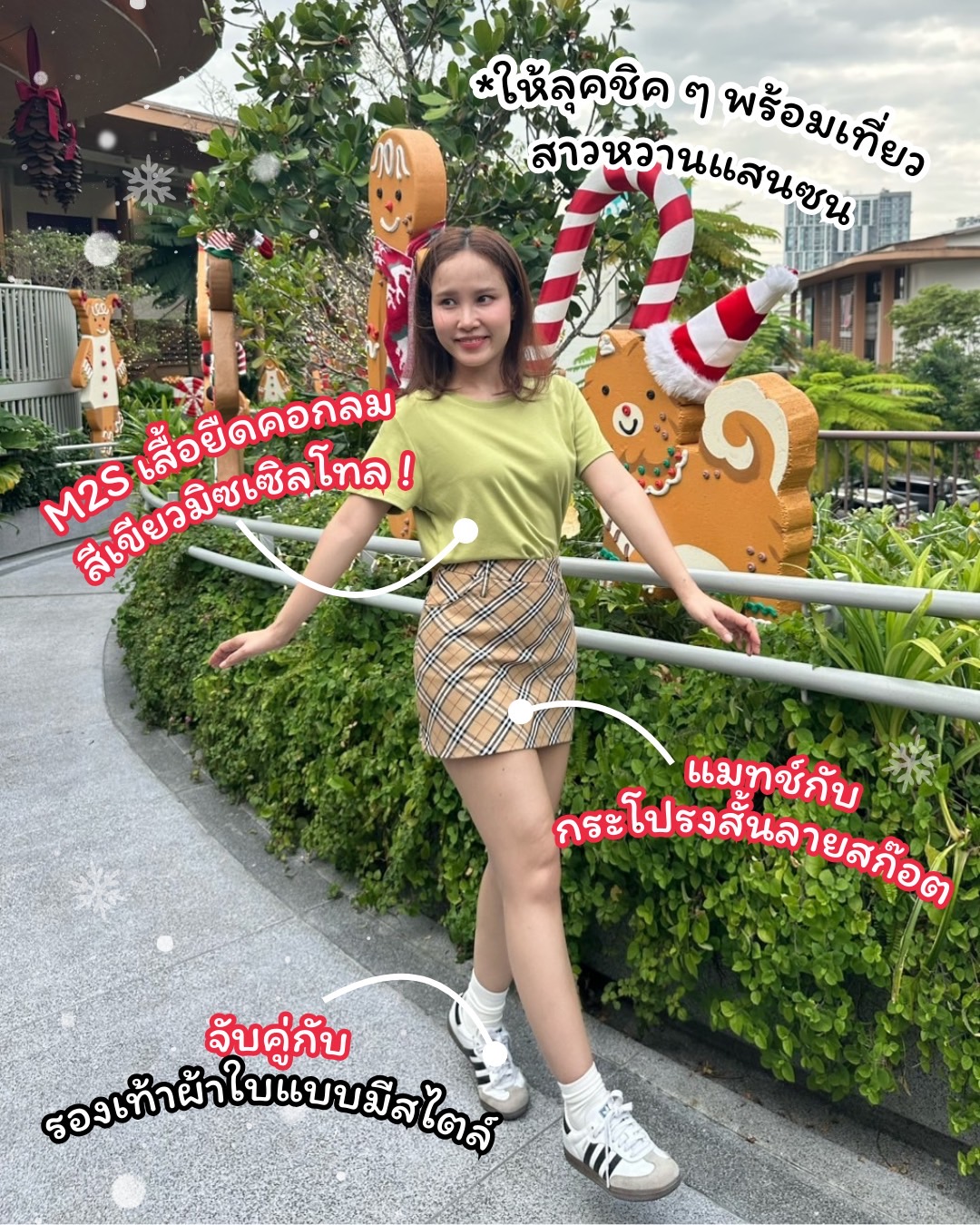 มาถึงลุคสุดท้าย! กับเสื้อยืดคอกลม M2S Lifestyle สีเขียวมิซเซิลโทล จับคู่กับกระโปรงยีนส์ทรงยาวเพิ่มความสดใสสไตล์สาวหวานแสนซน ให้ลุคที่ชิค ขี้เล่นแต่มีสไตล์สุด ๆ และยังเข้ากับงานเทศกาลคริสต์มาสและงานที่แสนอบอุ่นช่วงปลายปี อย่างเช่นปีใหม่อีกด้วย! บอกเลยว่า เสื้อสีเขียวมิซเซิลโทลจะเพิ่มความสดชื่นและความอบอุ่นให้กับลุค แมทช์เข้ากับกระโปรงสั้นลายสก็อตสุดเก๋ที่ให้ฟีลน่ารักปนเท่ เพิ่มความคล่องตัวและความสปอร์ตเล็ก ๆ กับรองเท้าผ้าใบสีขาว รับรองว่าลุคนี้เอาใจคนชอบสีเขียวสุด ๆ