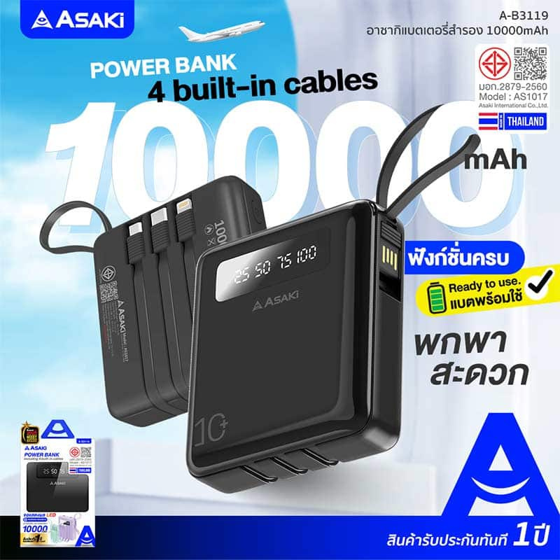 อีกหนึ่งตัวเลือกที่ตอบโจทย์สายพกจริงคือ Asaki Power Bank 10000 mAh รุ่น A-B3119 ที่เน้นความคุ้มค่า ขนาดกะทัดรัด ไม่กินพื้นที่ในกระเป๋า เหมาะกับคนที่ต้องการพาวเวอร์แบงก์ไว้สำรองแบตในสถานการณ์เร่งด่วน ทั้งสองรุ่นถือเป็นไอเทมเล็กแต่จำเป็น ที่ช่วยให้วันไหนแบตใกล้หมดก็ยังยิ้มได้