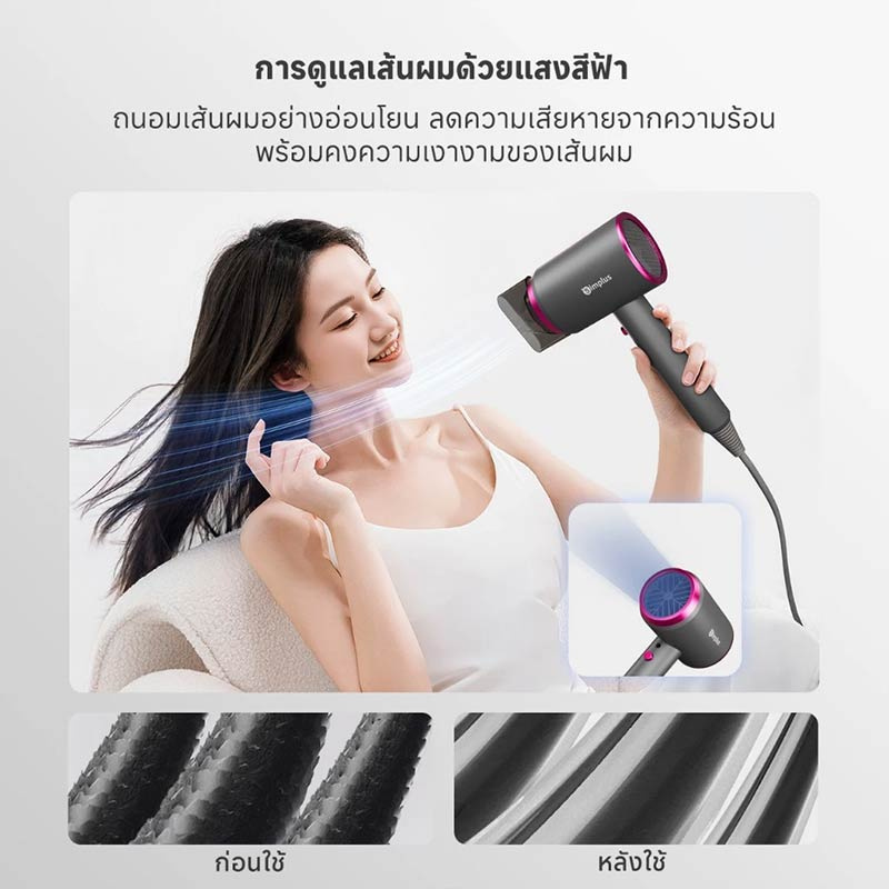 เพียงแค่เสียบปลั๊ก กดปุ่ม และสัมผัสถึงกระแสลมที่อุ่นกำลังดีจาก Simplus ไดร์เป่าผม 1250วัตต์ คุณจะรู้สึกได้ทันทีว่าผมเริ่มแห้งจากโคนจรดปลายอย่างรวดเร็ว ผมไม่พันกัน จัดทรงง่าย สัมผัสได้ถึงความนุ่มสลวย เงางามเป็นธรรมชาติ พร้อมกลิ่นหอมสะอาดสดชื่นที่ช่วยเติมเต็มความมั่นใจให้คุณเริ่มวันใหม่ได้อย่างสดใส