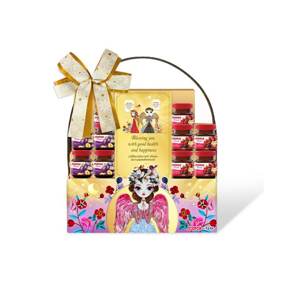 กระเช้าเพียวเร่มิกซ์ ด้านในบรรจุสก๊อตเพียวเร่ 40 มล. จำนวน 10 ขวดประกอบด้วย พรุน 5 ขวด + เบอร์รี่ 5 ขวด ก๊อตเพียวเร่พรุนช่วยเรื่องระบบขับถ่ายเพราะมีใยอาหารและเนื้อพรุน พร้อมวิตามินรวม ช่วยเรื่องผิวพรรณและต้านอนุมูลอิสระ ก๊อตเพียวเร่เบอร์รี่ื ช่วยในเรื่องของการบำรุงสายตา เรียกได้ว่าเป็นกระเช้าสุขภาพที่ได้ทั้งการบำรุงร่างกาย การขับถ่าย และสายตาอยู่ในกระเช้าเดียว