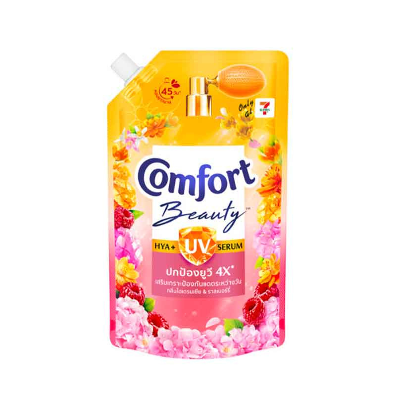 คอมฟอร์ท บิวตี้ ยูวี ปรับผ้านุ่ม สีชมพู กลิ่นไฮเดรนเยีย & ราสเบอร์รี่ ที่ให้กลิ่นหอมหวานผสมความสดใสจากผลไม้ พร้อมช่วยให้ผ้านุ่มสบายเมื่อสวมใส่