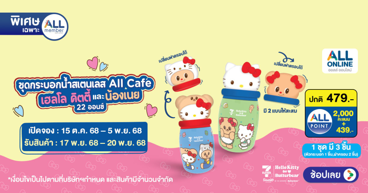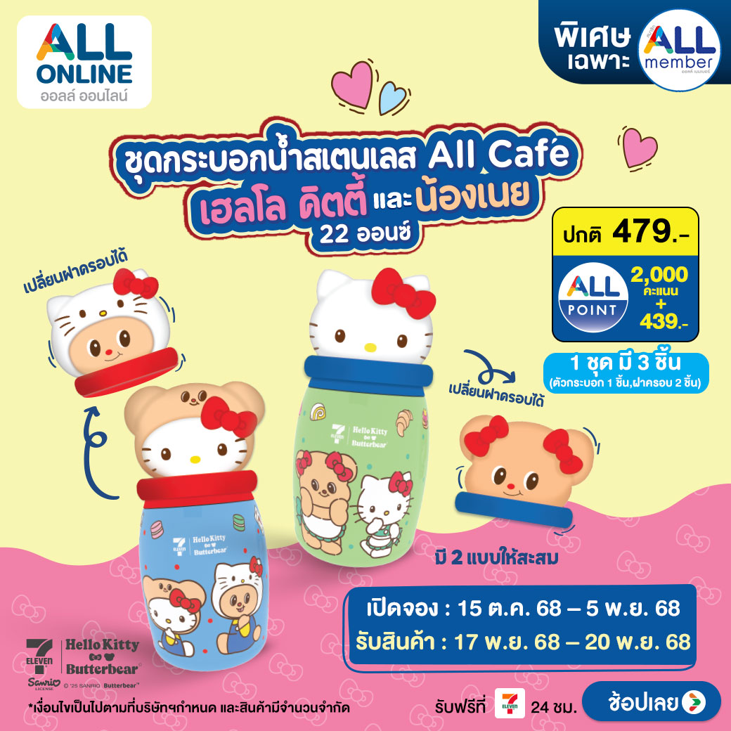 สายคิ้วท์เตรียมกรี๊ดให้สุดเสียง! 🐻💗 เพราะ All Cafe จับมือกับสองคาแรกเตอร์ขวัญใจอย่าง Hello Kitty x Butterbear ออกคอลเลกชันสุดพิเศษ “กระบอกน้ำสเตนเลส All Cafe Hello Kitty x Butterbear” ดีไซน์น่ารักละลายใจ ที่เห็นแล้วอยากกดพรีออเดอร์ทันที!